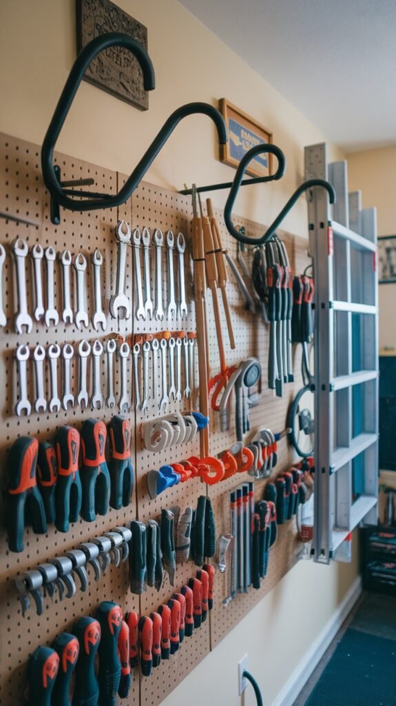 Alongside bins and shelves, wall-mounted hooks and pegboards are invaluable for hanging tools and outdoor equipment. This method not only declutters the work surface but also keeps items within reach. Heavy-duty hooks can accommodate larger tools, such as bicycles, ladders, and hoses. Smaller hooks can hold hand tools, making them easy to identify and grab quickly.